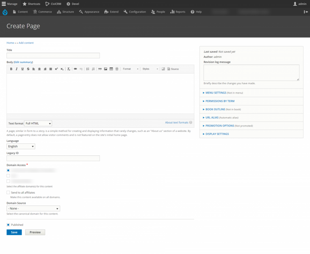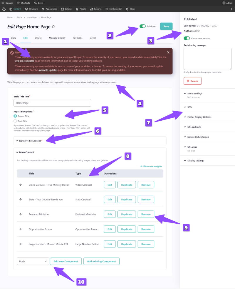 Improve Your Drupal Content Management Experience February 22, 2022 by Brad DeForest Thinking in: CMS/Websites, Design Content management for your website should be easy, even if your site is highly complex. Over the years, we have continually improved the backend experience for the Drupal websites we develop. Our goal is to make it easier for administrators at nonprofit organizations to manage existing content and create new content. We have been focused on three main improvements: Content Administration ViewsOrganization and sequence of information on the Content Edit pageSimplifying Administrator controls for design and customization In this article, we’ll look at the last two all at once, showing you our content edit form. If you want to learn more about the first one you can read a blog post that Brent, our Senior Designer here at BackOffice Thinking, wrote about Content Administration Views in Drupal. Improved Content Edit Form Layout for Drupal 9 CMS In our latest project, we have focused on the overall organization and theme of the content edit form. The backend page content is where administrators and editors probably spend the most time. The best way to explain what we have done is to look at the screenshots below. Here is the out-of-the-box Drupal backend: As you can see in the image below, this new backend admin theme helps clean up the overall display. It is not only easier on the eyes, but also more intuitive and functional for our clients’ needs. Let’s walk through the elements that make this form more user friendly (follow along with the purple numbers in the screenshot): Important information and error messages presented clearly at the top of the screenProminent save and publish buttonsStatus, updated date and time, and author all immediately visible, no need to scroll downDescriptive messaging to help new admin users understand what they can do on this page typeSpecific layout options, with clear help notes, that give the admin-user easy control over key elements of page designCollapsible sections to help organize the page fields, with the most important sections expanded by defaultSecondary content settings like SEO options are kept in a sidebar, with the main body of the page focused on the actual content that will display on the websiteThe Landing Page and Component Framework offers flexibility and design consistency by giving users a “kit-of-parts” that can easily be added to, removed, and rearrangedEach individual component has its own buttons to enable editingOne-click access for adding new content components to the page Let’s face it, the out-of-the-box Drupal backend for administrators is not always easy and intuitive to use! But the beauty of Drupal is that with some fairly simple configuration and organization adjustments, it can be a power tool, catered specifically for your unique needs as an administrator of a complex Mission Delivery Platform. When we design and develop new websites for nonprofits, we know that the backend admin user experience matters just as much as the frontend design. Upgrade Your Drupal BackendIf you have an existing Drupal 9 website, contact us for help implementing some or all of these techniques above. If you have a Drupal 7 website, consider whether it’s time to make the move to Drupal 9! Check out our blog post titled Drupal 7 Is “Sunsetting” in 2023 to figure out your next steps. If and when you decide to upgrade, we’re here to help – and this improved backend design experience awaits. Share via: Facebook Twitter LinkedIn